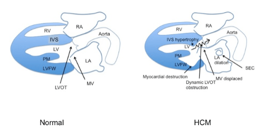 Leyenda de la imagen: Corazón normal en la izquierda. RV: ventrículo derecho; LV: ventrículo izquierdo; RA: Atrio derecho; LA: Atrio izquierdo; MV: Válvula mitral; LVOT: Paso de circulación de sangre del ventrículo izquierdo; IVS: septum intraventricular; PM: músculo papilar; LVFW: pared sana del ventrículo izquierdo. A la derecha, corazón afectado por HCM con desplazamiento de la válvula mitral. El septum intraventricular (IVS) se ha hipertrofiado y ha empujado a MV (válvula mitral), que se ha desplazado contra el septum, provocando una obstrucción dinámica del flujo de sangre (LVOT).