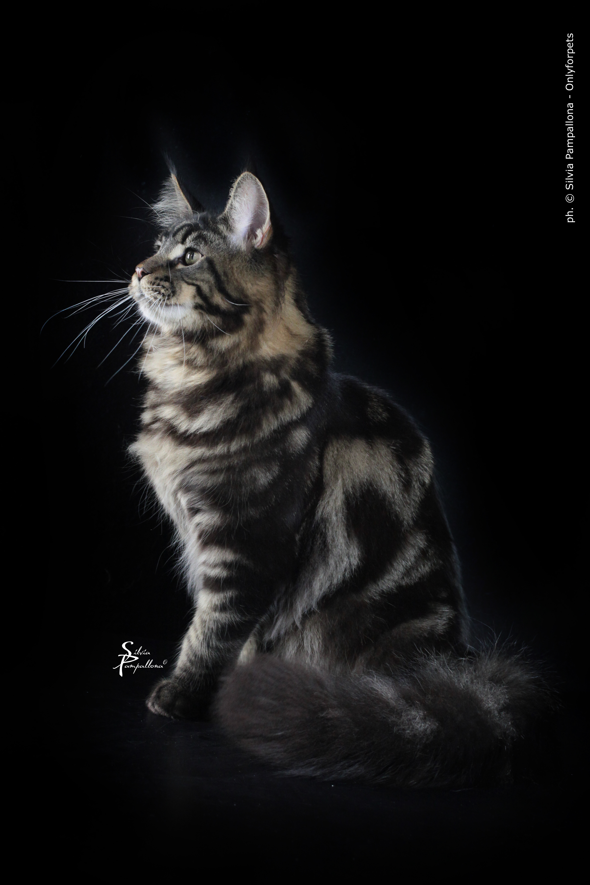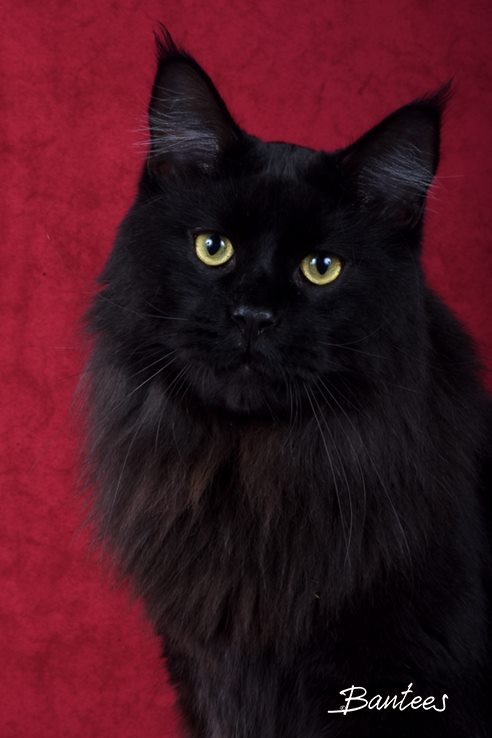 Así que combinando los dos genes que hemos visto hasta ahora, el negro (B) y el Agouti (A), un Maine Coon puede ser negro sólido (B* aa; foto derecha, RW SGC Vademar Blade) o bien negro tabby (B* A*; foto izquierda CH Vademar Dark Vader).