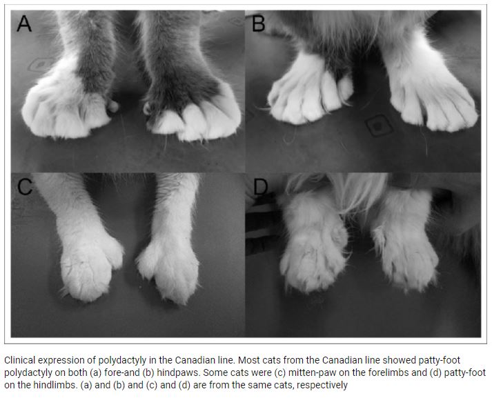 La polidactilia pre-axial (del lado del pulgar) da lugar a patas a las que se las suele llamar «mitones», por su semejanza, en forma, con los típicos guantes sin dedos, excepto el pulgar.