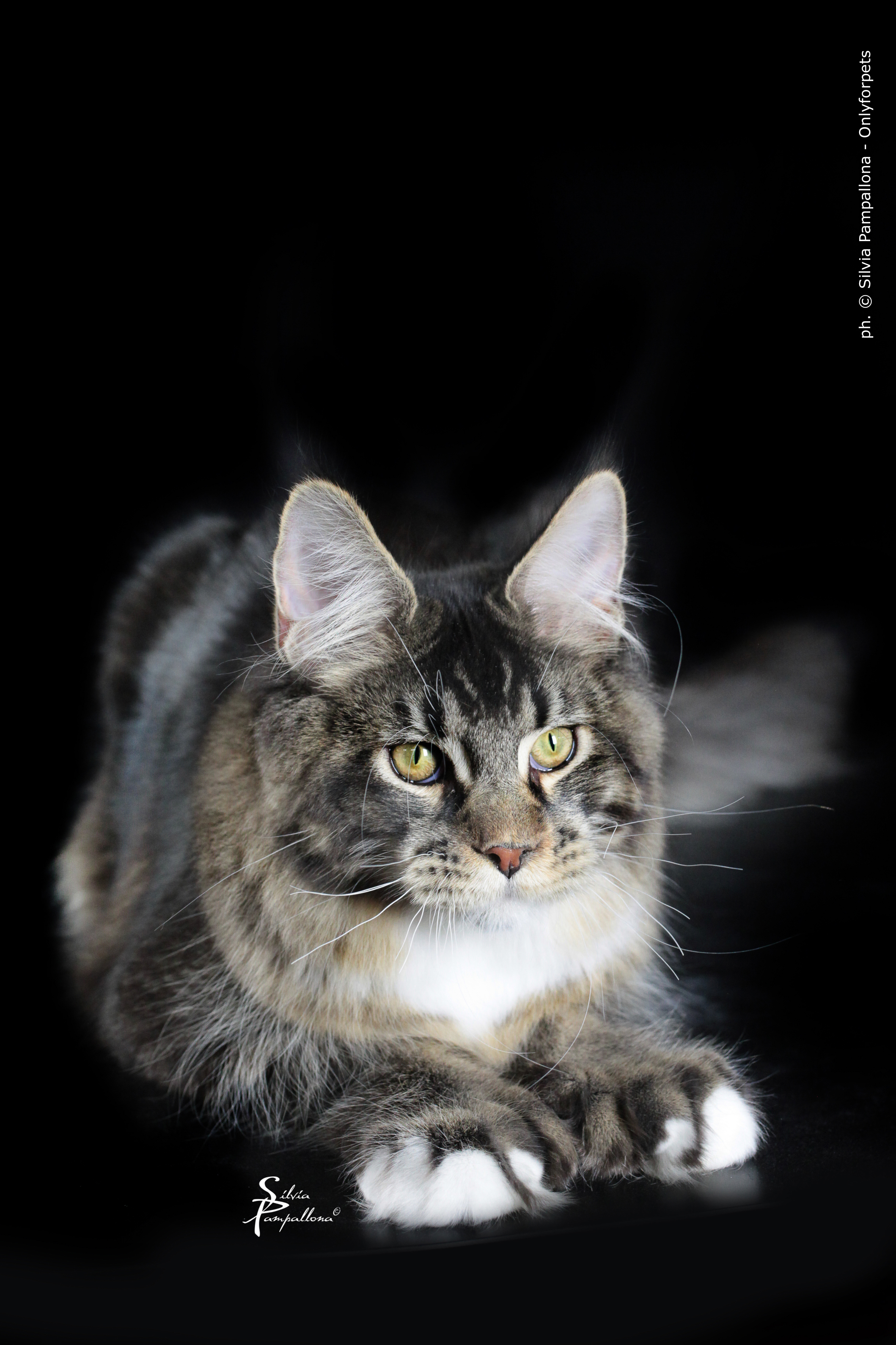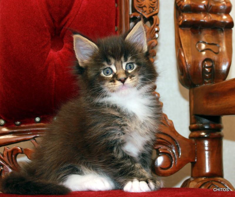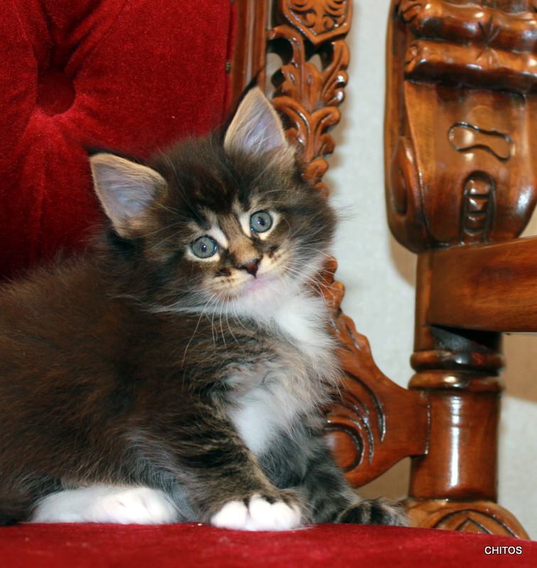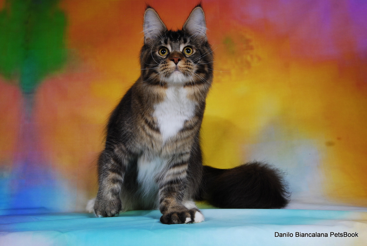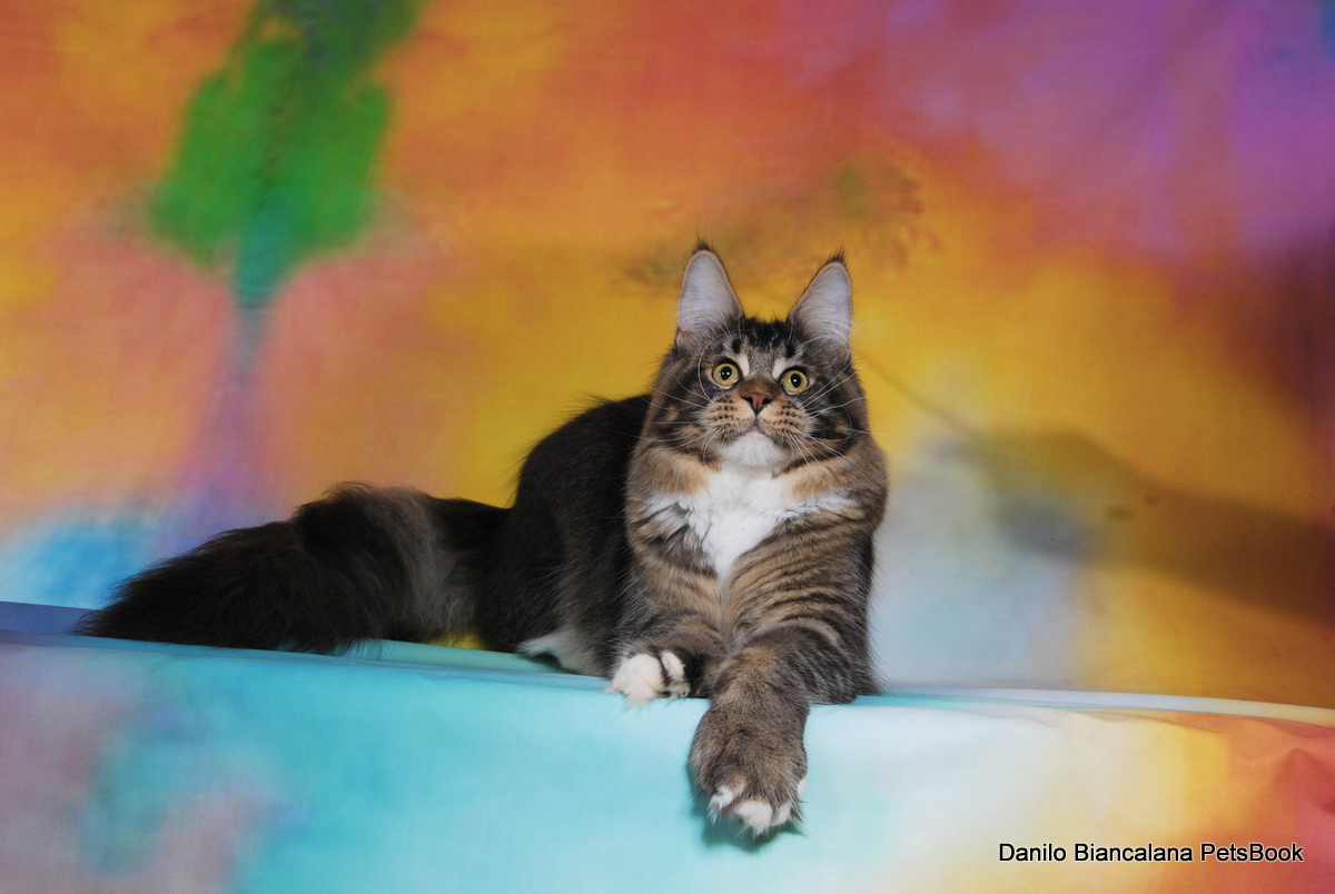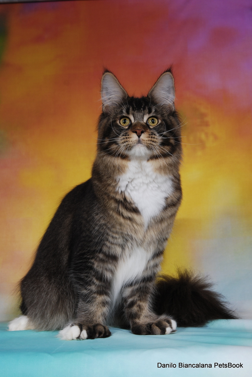 Nuestro gran niño polydáctyl. Llegado de Rusia a nuestras vidas, fue llegar y conquistar. Un gato excepcional: en pedigree, en cuerpo, solidez, excepcional tabby ticked, con una polidactia muy bonita (6-6-6-6), manoplas en patas delanteras y raqueta de nieve en traseras. Es un gato pesado; aún cuando está delgado (es un gato muy apasionado y en época de celo se estresa y pierde peso) no baja nunca de 8kg con poco más de un año. Su carácter y comportamiento en exposiciones también ha enamorado a muchos jueces, así que, en apenas una temporada, ha conseguido ya su Supreme Grand Champion. Ha quedado dos veces consecutivas mejor Maine Coon Polydactylo del mundo, en categoría cachorro y en categoría adulto.