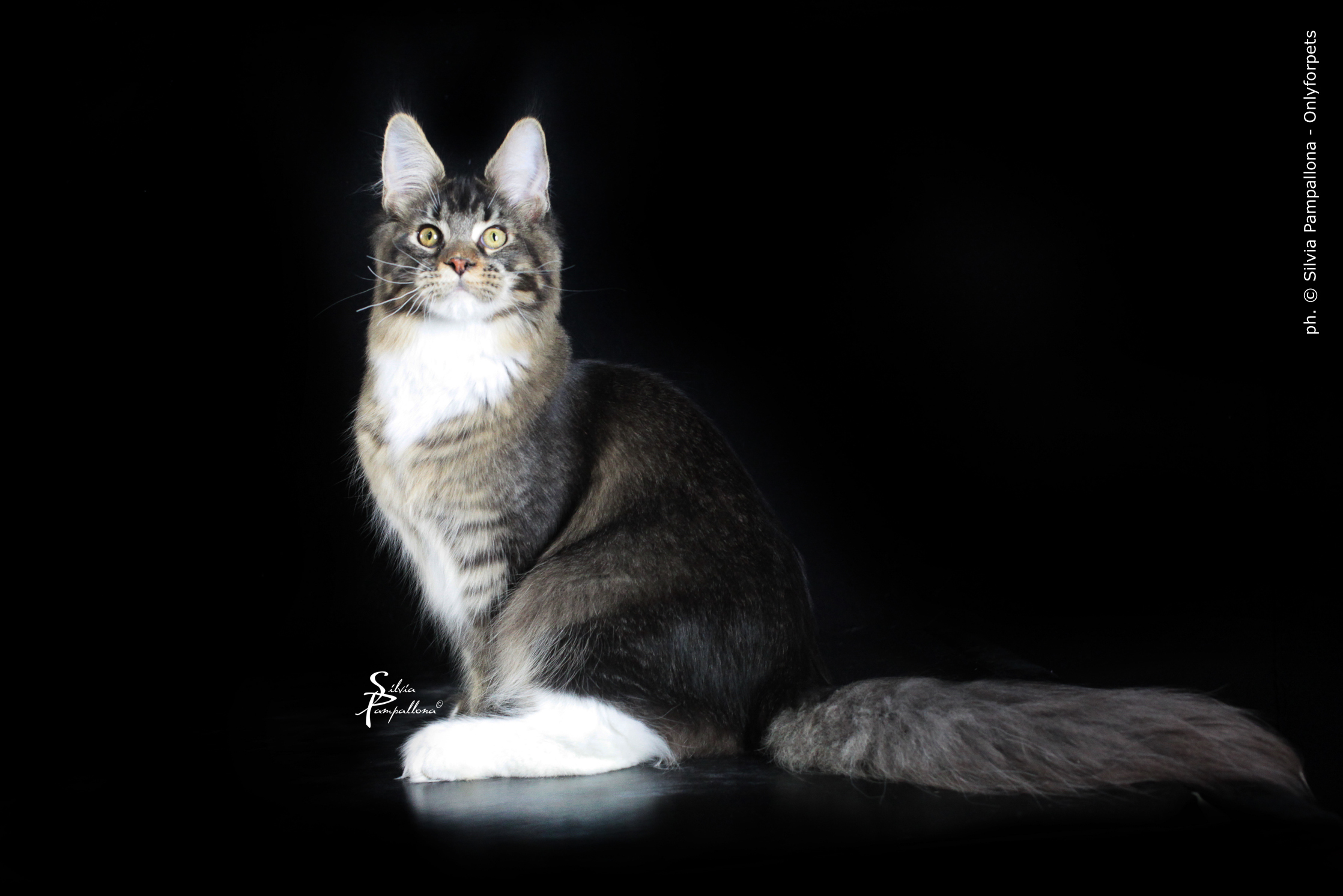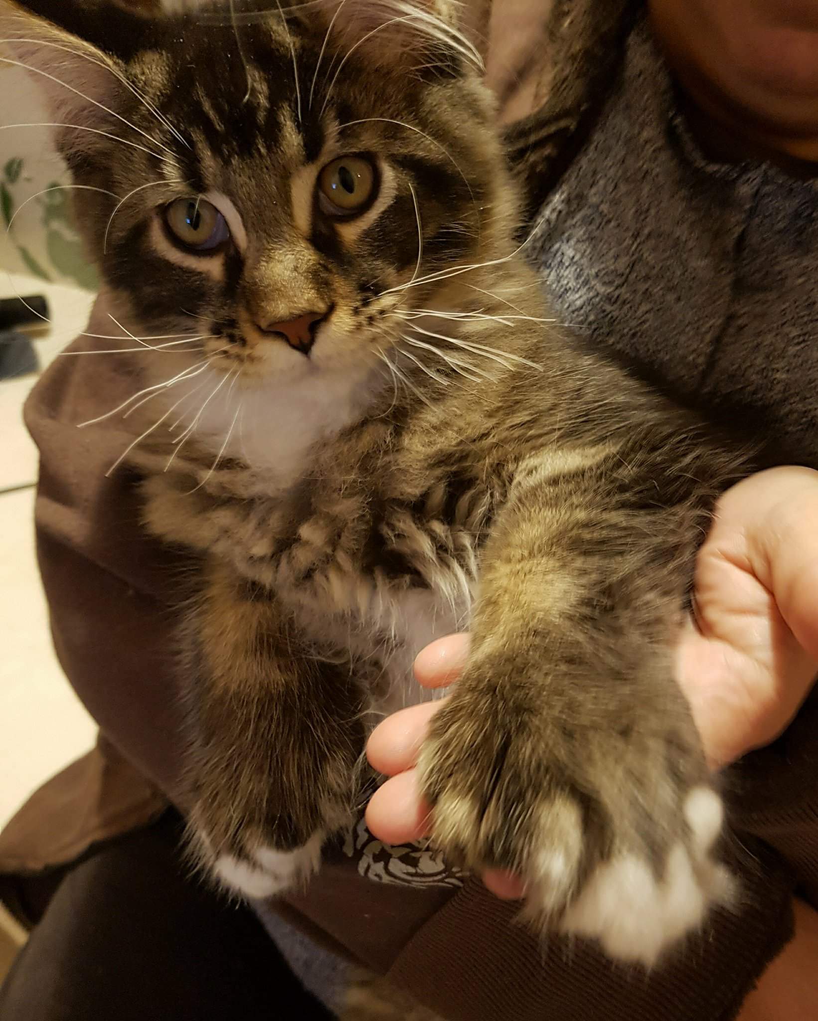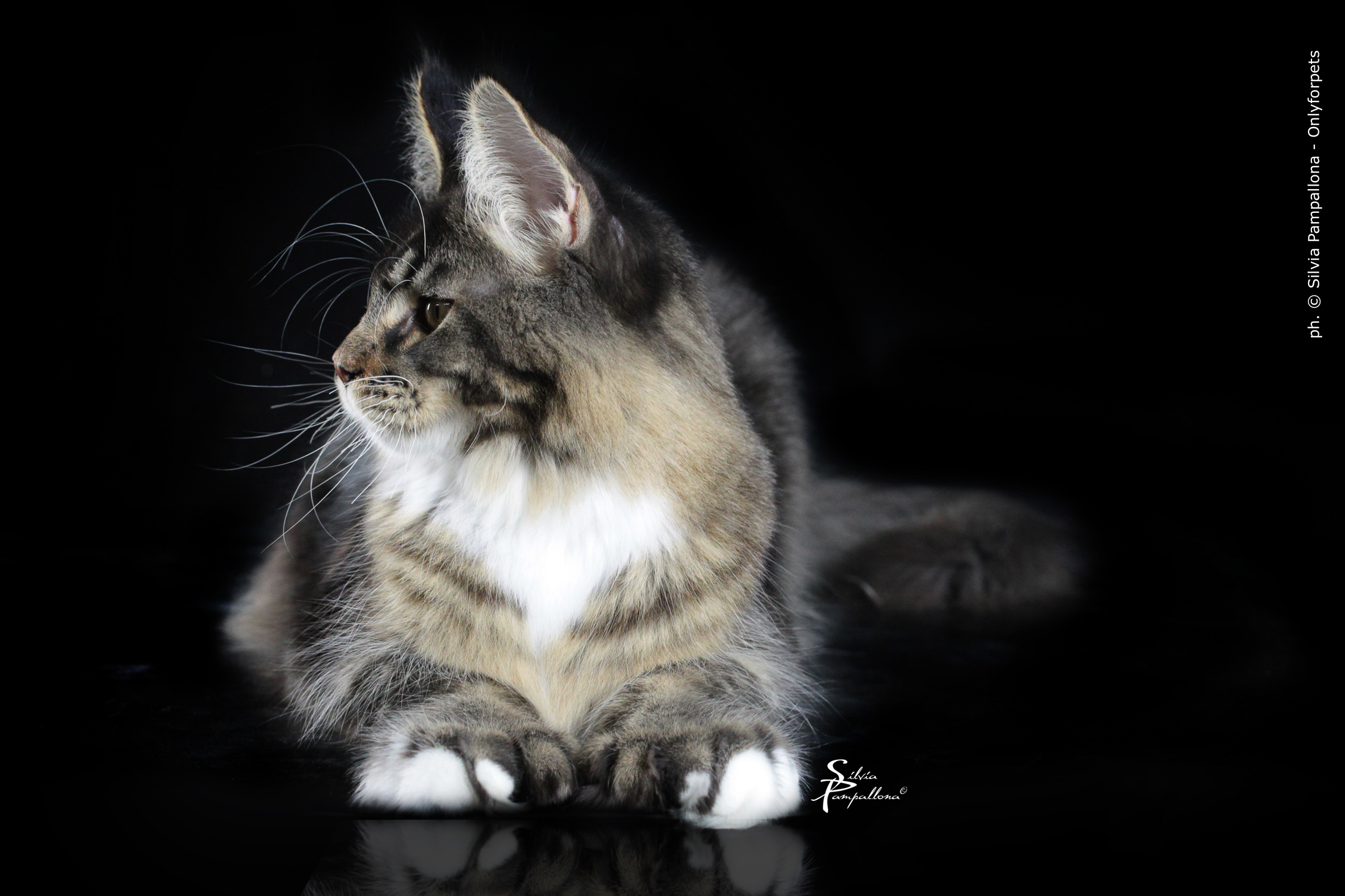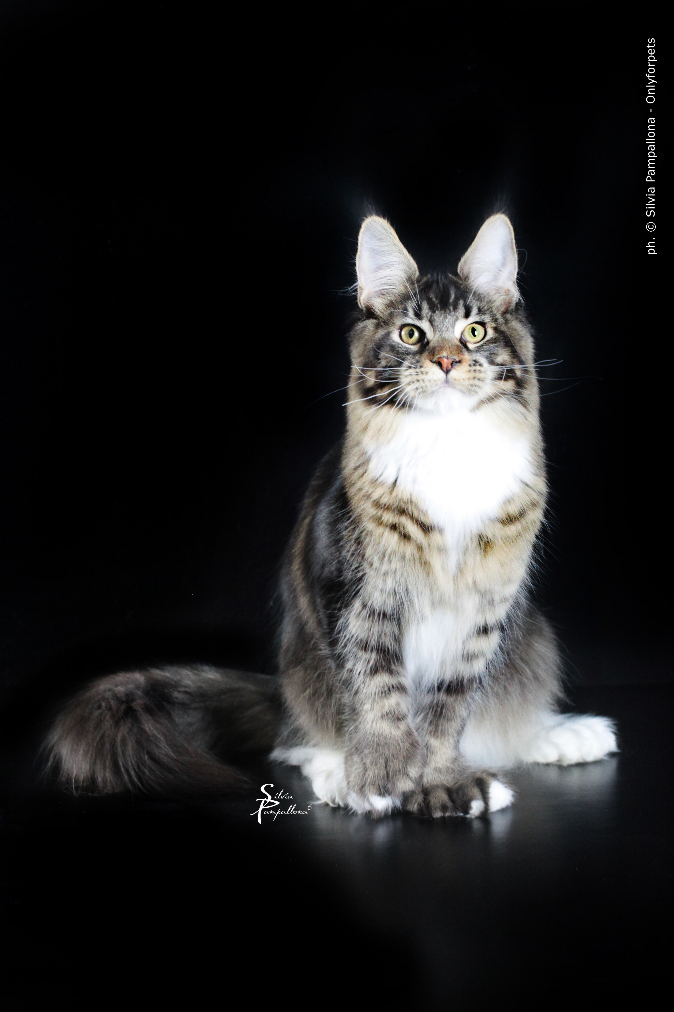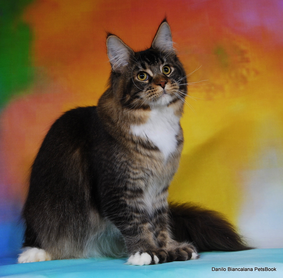 Nuestro gran niño polydáctyl. Llegado de Rusia a nuestras vidas, fue llegar y conquistar. Un gato excepcional: en pedigree, en cuerpo, solidez, excepcional tabby ticked, con una polidactia muy bonita (6-6-6-6), manoplas en patas delanteras y raqueta de nieve en traseras. Es un gato pesado; aún cuando está delgado (es un gato muy apasionado y en época de celo se estresa y pierde peso) no baja nunca de 8kg con poco más de un año. Su carácter y comportamiento en exposiciones también ha enamorado a muchos jueces, así que, en apenas una temporada, ha conseguido ya su Supreme Grand Champion. Ha quedado dos veces consecutivas mejor Maine Coon Polydactylo del mundo, en categoría cachorro y en categoría adulto.