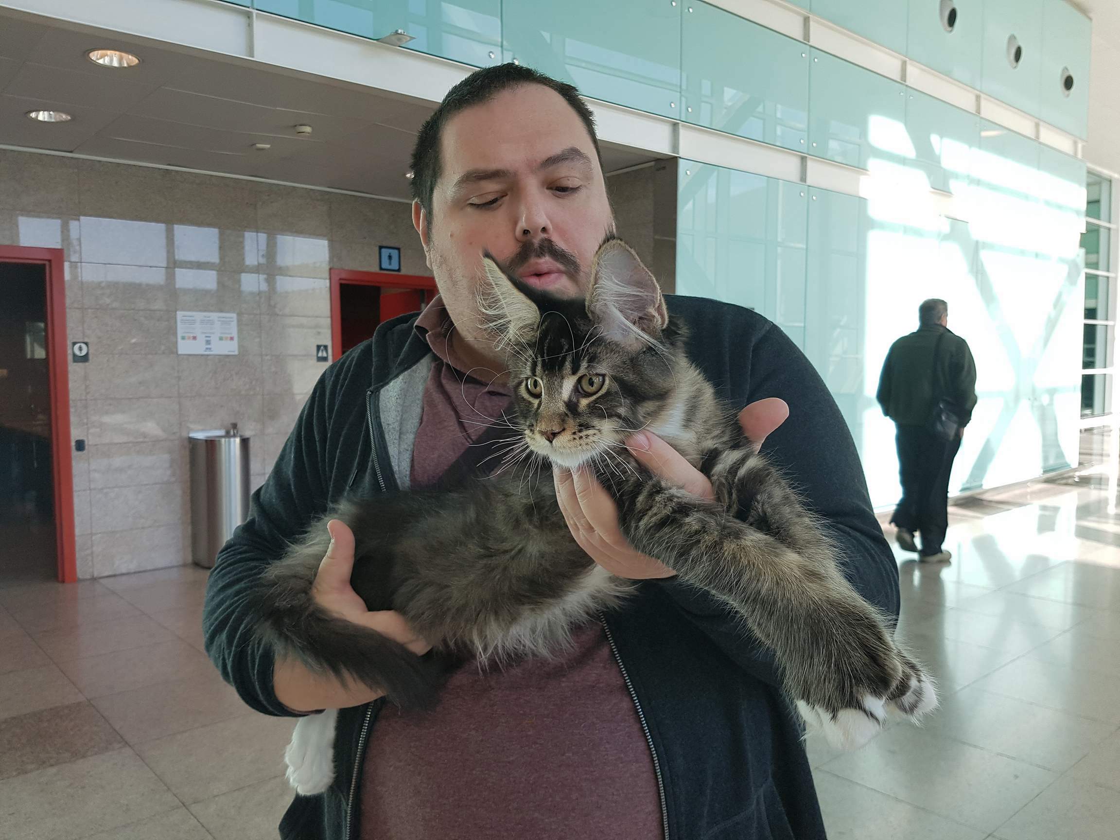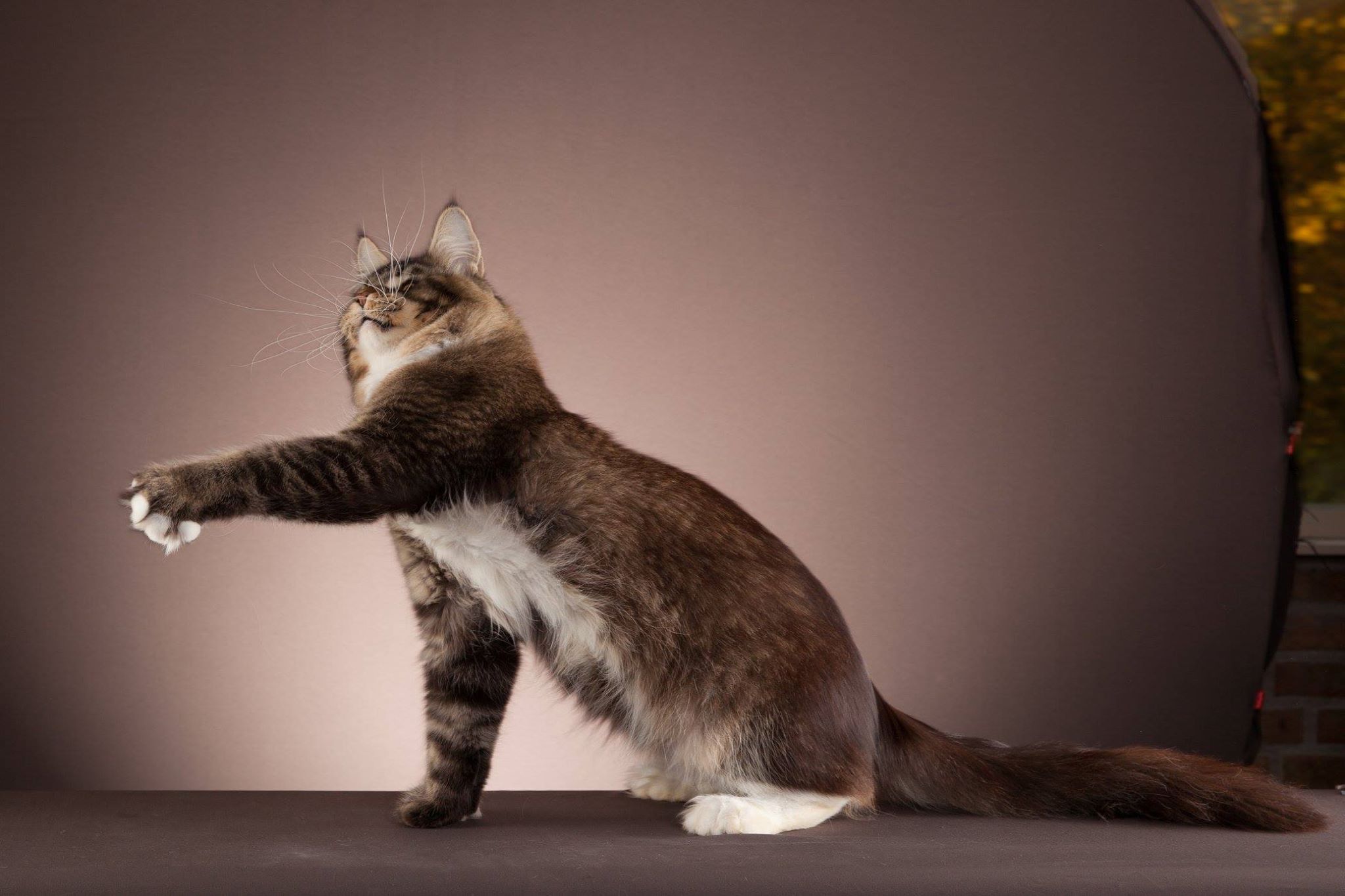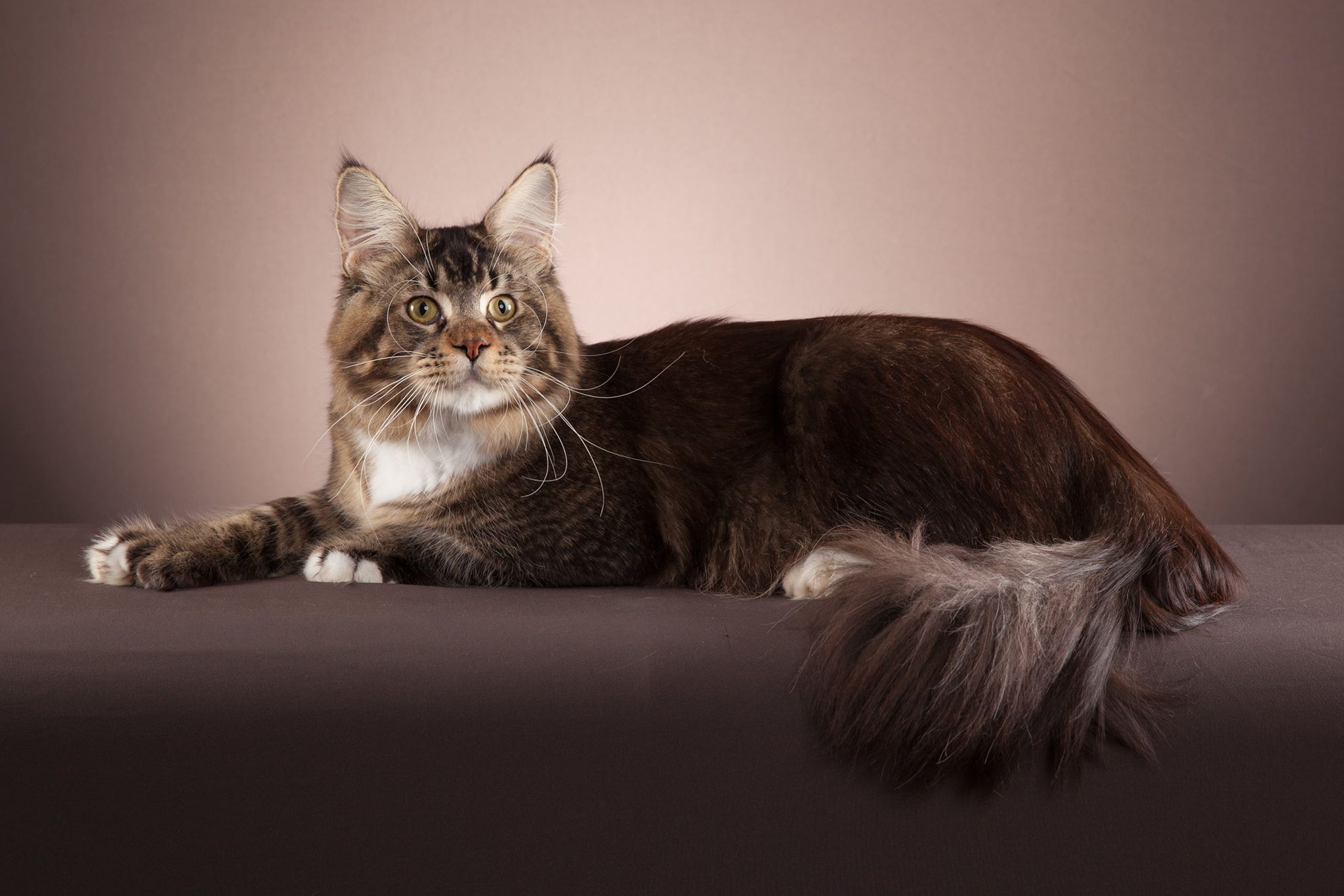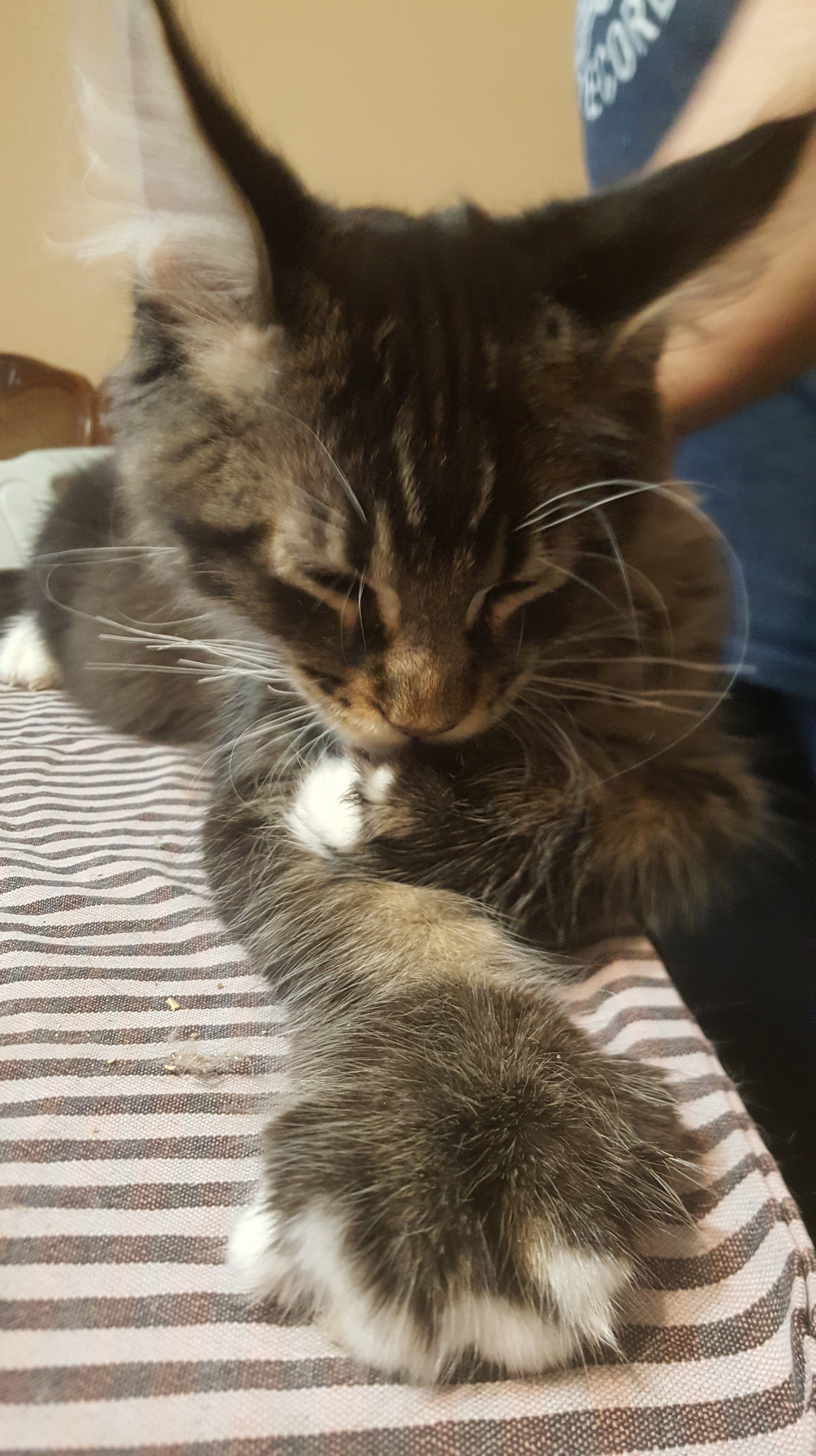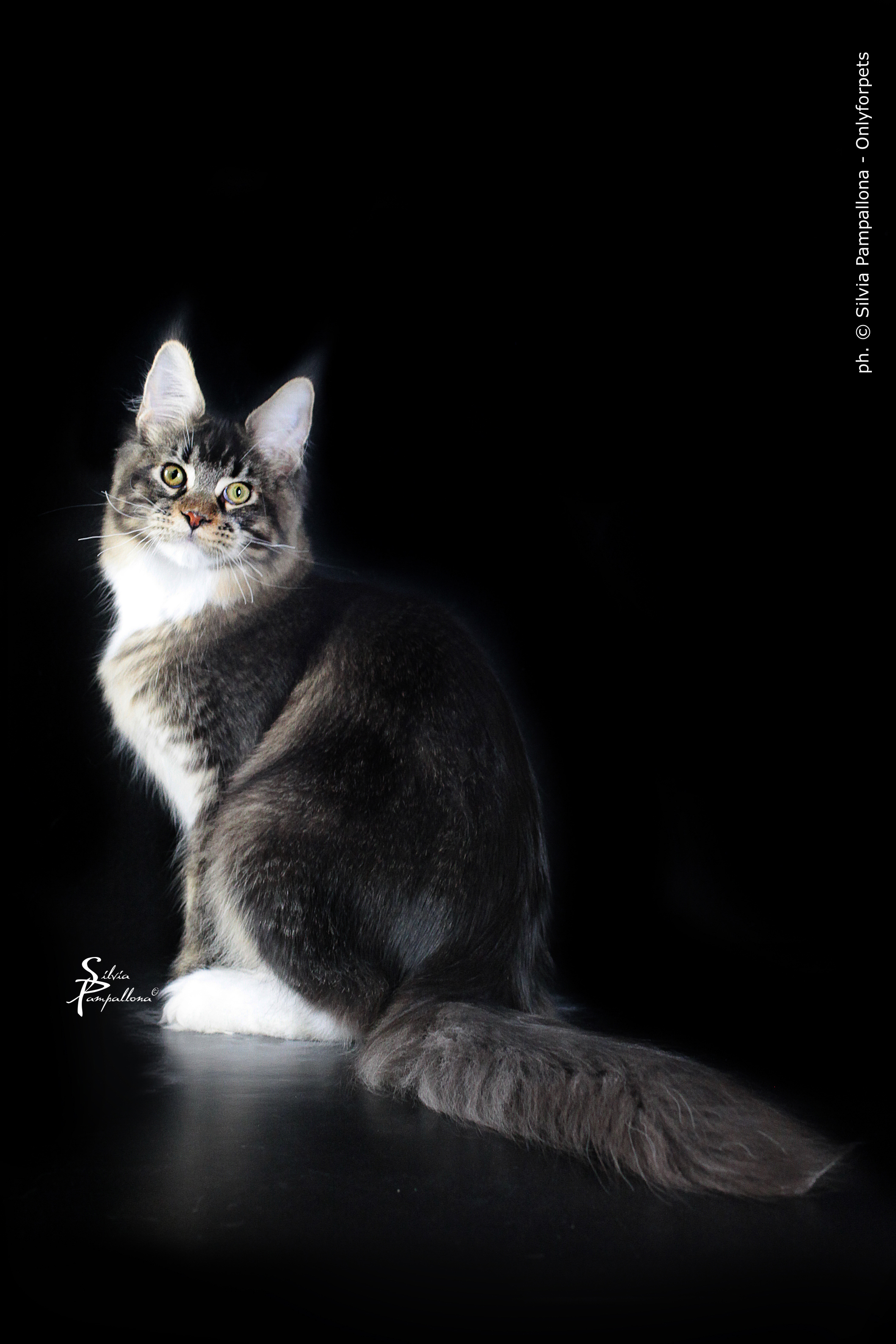 Nuestro gran niño polydáctyl. Llegado de Rusia a nuestras vidas, fue llegar y conquistar. Un gato excepcional: en pedigree, en cuerpo, solidez, excepcional tabby ticked, con una polidactia muy bonita (6-6-6-6), manoplas en patas delanteras y raqueta de nieve en traseras. Es un gato pesado; aún cuando está delgado (es un gato muy apasionado y en época de celo se estresa y pierde peso) no baja nunca de 8kg con poco más de un año. Su carácter y comportamiento en exposiciones también ha enamorado a muchos jueces, así que, en apenas una temporada, ha conseguido ya su Supreme Grand Champion. Ha quedado dos veces consecutivas mejor Maine Coon Polydactylo del mundo, en categoría cachorro y en categoría adulto.