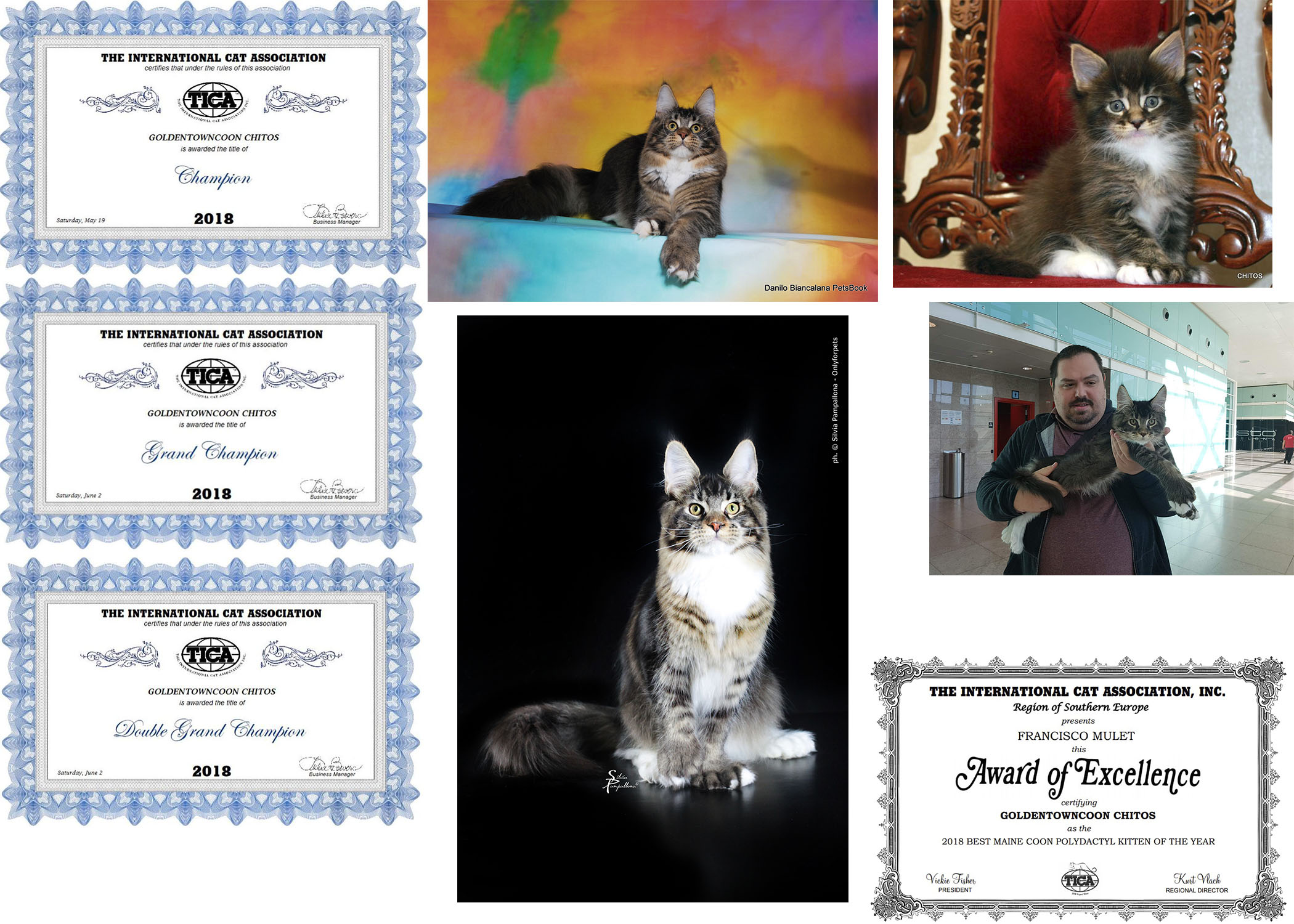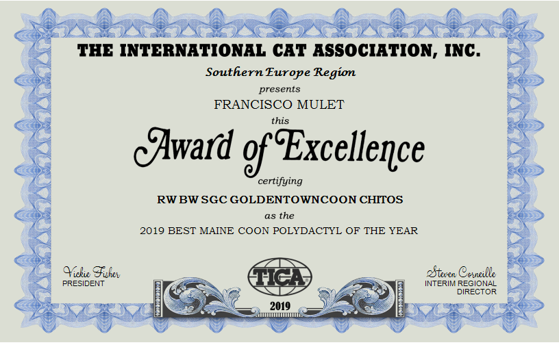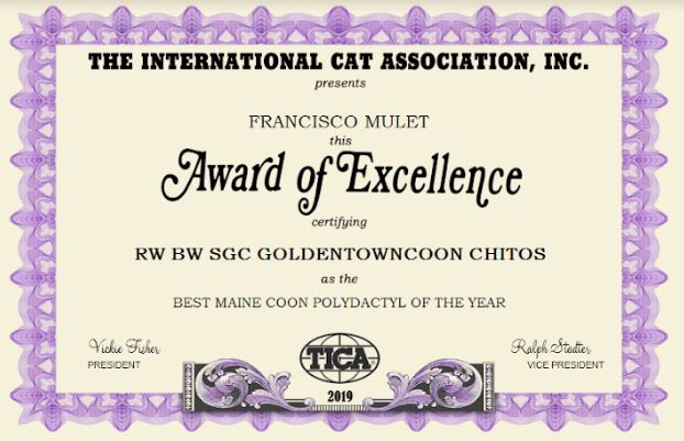 La temporada 18/19 ha sido extraordinaria para nuestro Chitos, consiguiendo el título de Supreme Grand Champion, el título de Regional Winner y el Título de Best of Breed, además de un premio especial por ser el mejor Maine Coon Polydactyl de color brown tabby ticked con blanco.