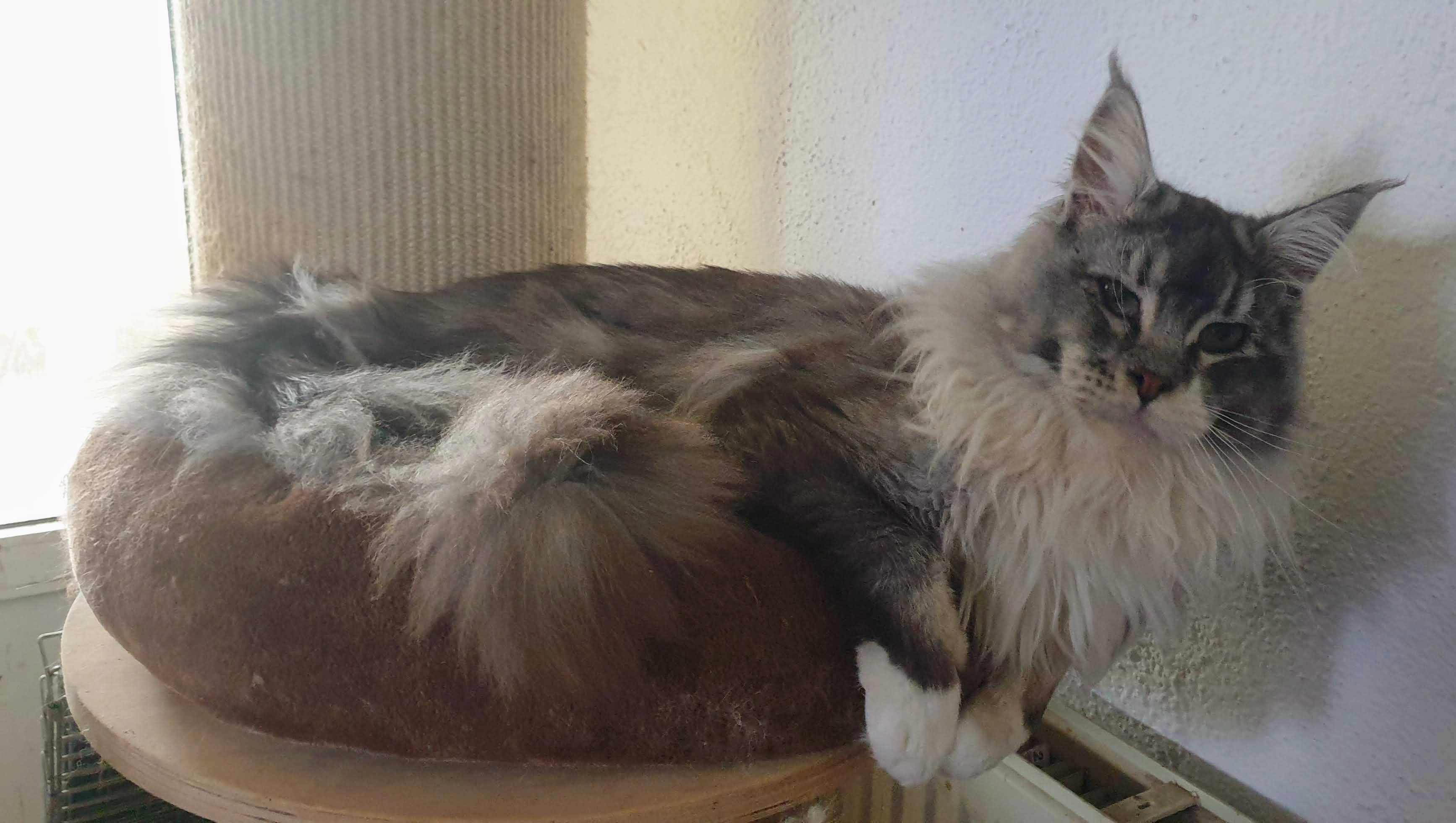 Vademar Neko II es un joven adulto nacido en casa, de un precioso Black silver tabby ticked con blanco y, aunque inicialmente no pensábamos en conservarlo para cría, su carácter, su asombroso crecimiento y su precioso color nos convenció. Neko no ha podido ir de exposición, nacido en pleno COVID, pero esperamos que cuando todo vuelva a su cauce, nos dará muchas alegrías en show. Es un gato muy cariñoso, grande y peludete.