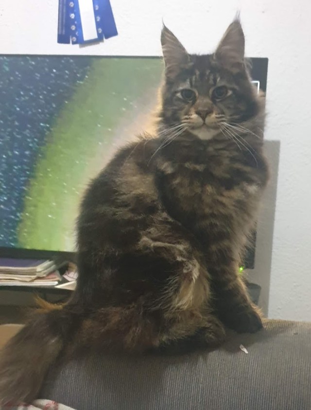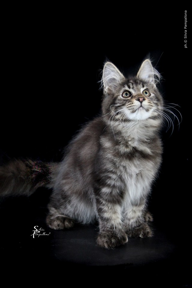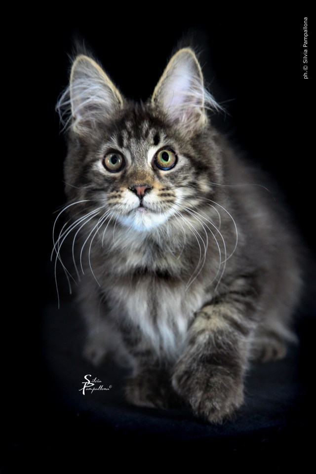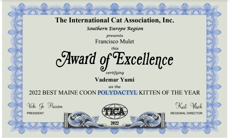 Nuestro Yumi nos pareció uno de los cachorros más encantadores que habíamos tenido nunca, nos robó el corazón casi nada más nacer. Su carácter es excelente, muy parecido al de su padre, nuestro campeonísimo RW BS SGC Goldentowncoon Chitos of Vademar. Esperamos que pueda tener una exitosa carrera como la de su padre. A pesar del COVID, en la temporada 2021-2022 conseguimos presentarlo, con 4 meses recién cumplidos, en el show de Cremona (Italia), consiguiendo excelentes resultados, con 7 finales de ring. Ello le ha permitido obtener el Award Excellence al Mejor Cachorro Maine Coon Polydactylo de la Región de Europa Sur, y también el Country Award al Mejor Cachorro de España, presentado en exposición esta temporada.